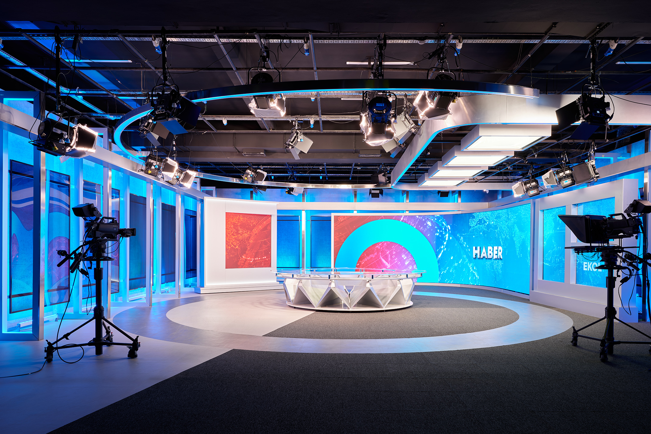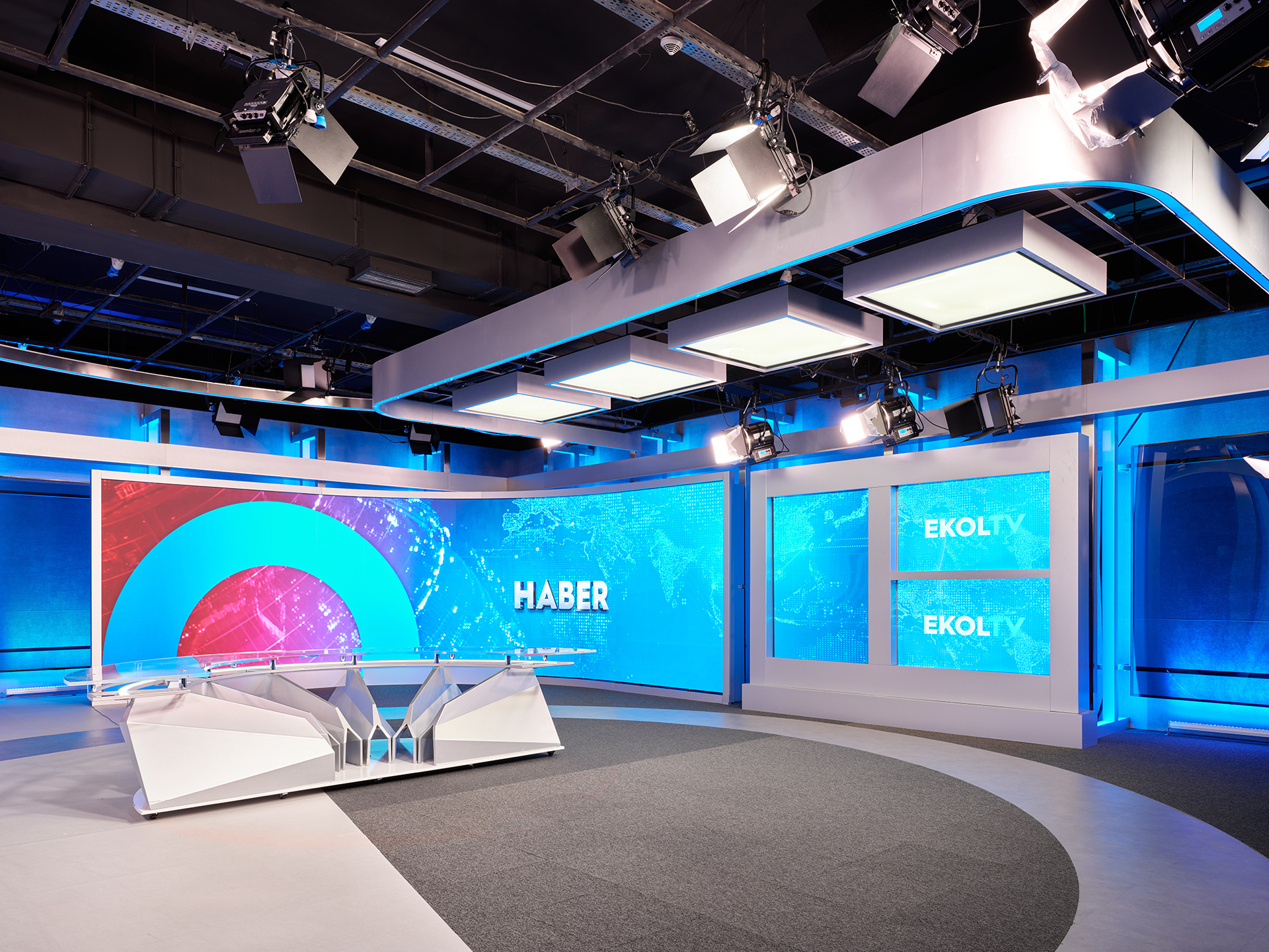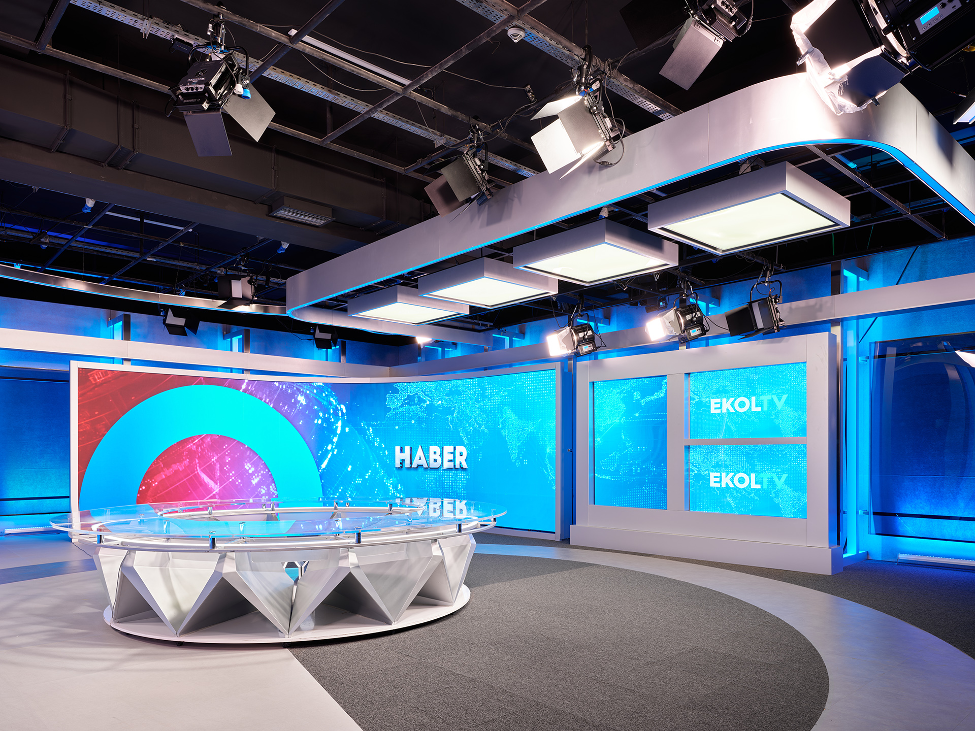 The modular desk system enhances workflow by adjusting its form, ensuring flexibility to support content production, while also offering viewers a contemporary and professional presentation. Metallic details and transparent surfaces are integrated with technological equipment such as high-tech LED screens, lighting elements, and advanced electrical infrastructures to create a suitable environment for modern media production processes.