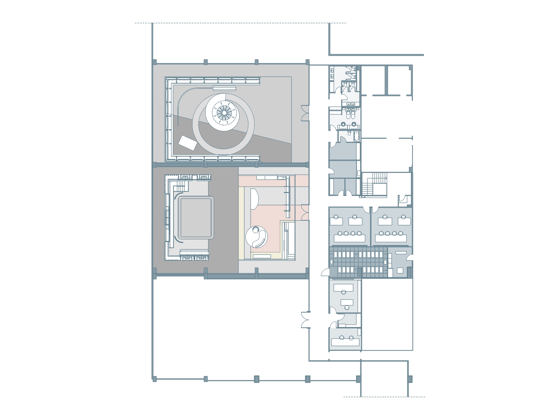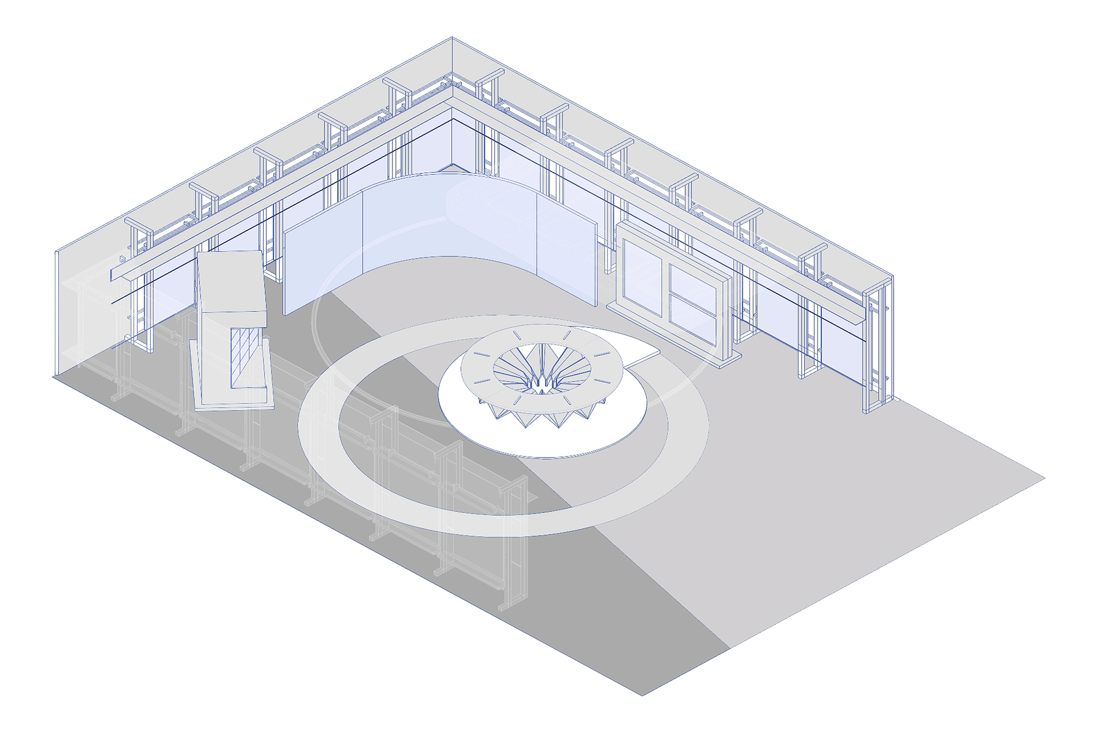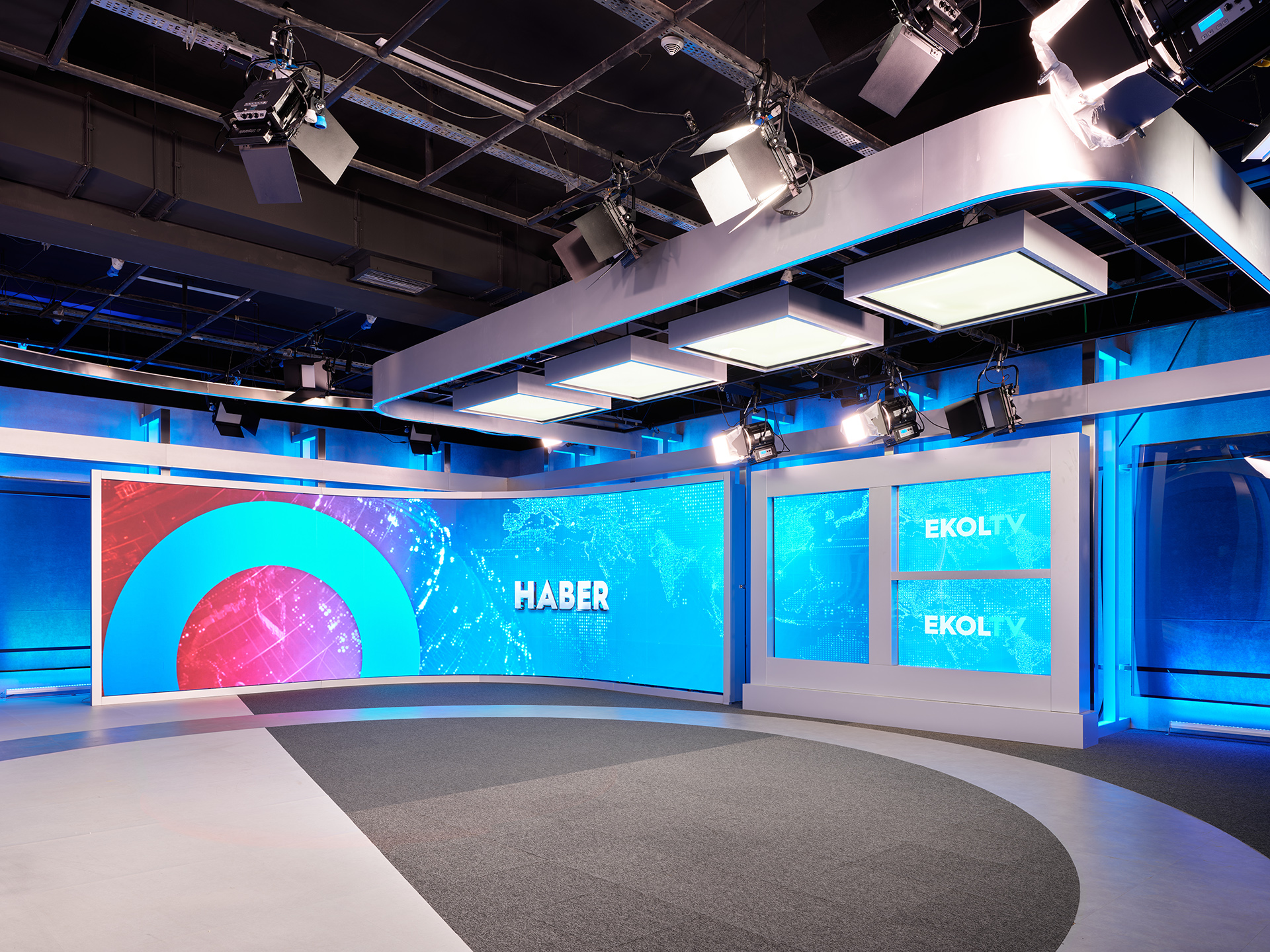 The modular desk system enhances workflow by adjusting its form, ensuring flexibility to support content production, while also offering viewers a contemporary and professional presentation. Metallic details and transparent surfaces are integrated with technological equipment such as high-tech LED screens, lighting elements, and advanced electrical infrastructures to create a suitable environment for modern media production processes.